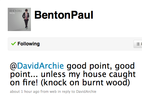 #大衛安慰完BentonPaul之後,Benton在twitter上回他:老闆你說的有道理,除非我家給火燒了,不然明天一定會更好,這個Benton真敢說哪!
